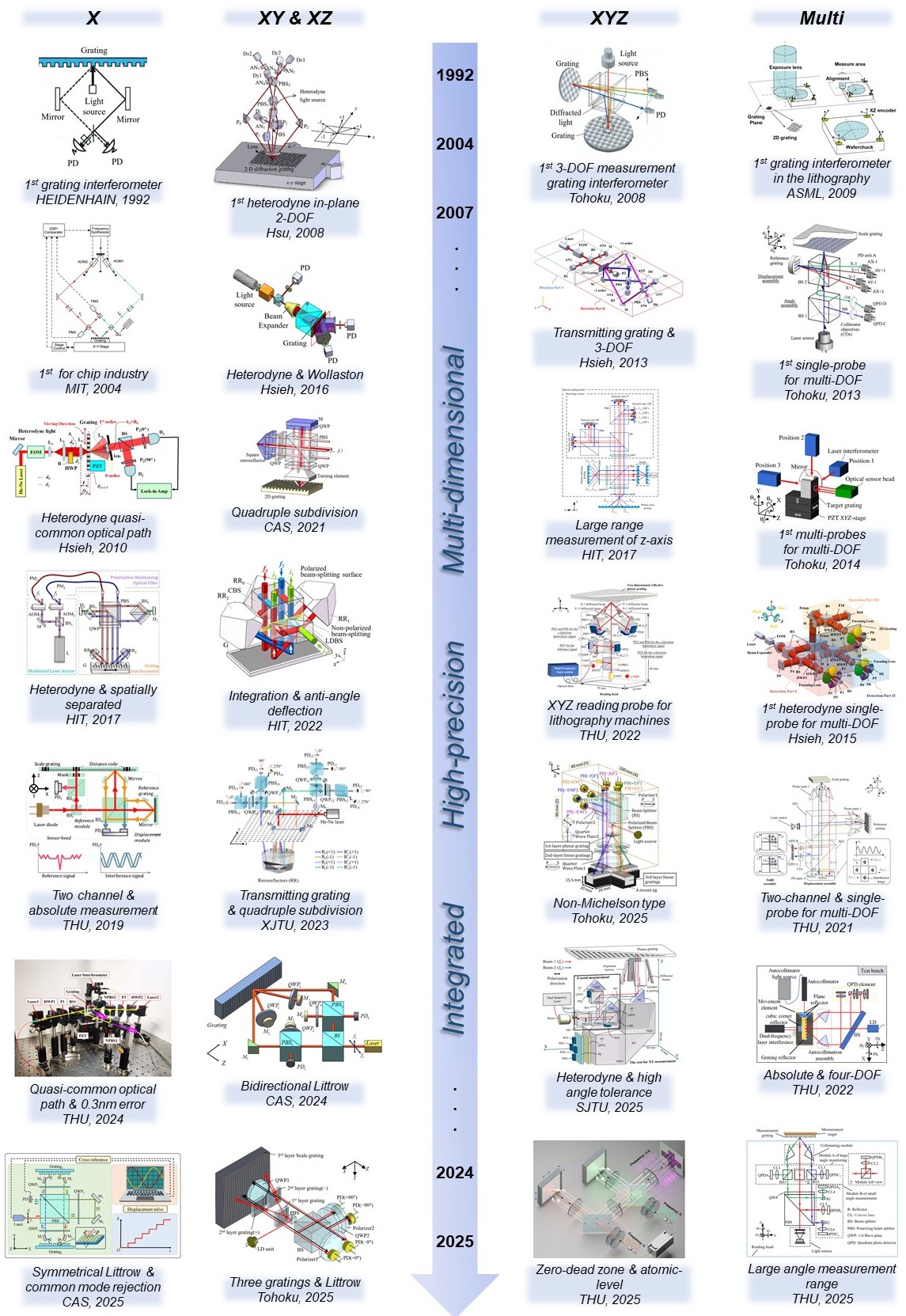 光栅干涉仪通过利用光的衍射效应和干涉原理,能够在极短的测量距离内实现超高精度的位移和角度测量。与传统的激光干涉仪相比,光栅干涉仪具有更短的光路、更高的环境适应性和较低的成本,特别适用于需要高精度、多自由度同步测量的场合,如量子计算、精密光刻、航空航天等领域。文章指出,近年来光栅干涉仪的技术不断突破,尤其是在1-DOF、2-DOF、3-DOF以及多自由度系统的研究中取得了显著进展。通过不同的光栅配置与光学路径设计,光栅干涉仪系统已经能够同时进行多个方向的高精度测量,满足现代高端制造的需求。