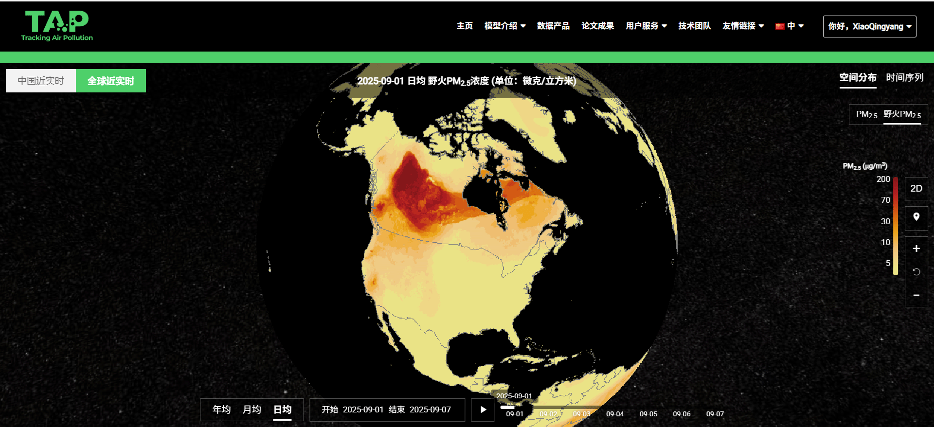 图1.TAP平台提供的全球野火PM2.5浓度近实时反演数据