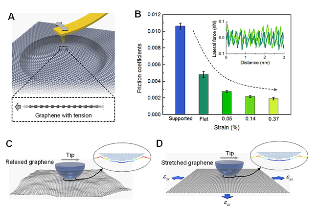 图1.(A)石墨烯应变加载和摩擦力测试过程示意图;(B)石墨烯表面摩擦系数随应变的变化;(C)松弛石墨烯和探针针尖接触状态示意图;(D)拉伸状态下石墨烯和探针针尖接触状态的示意图。