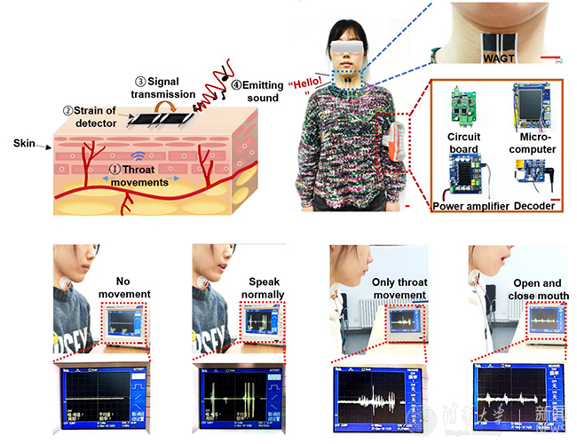 首页网7月16日电 7月9日,心博在线登录入口微电子所任天令教授团队在纳米领域重要期刊《美国化学学会纳米》(ACS Nano)上发表了题为《一种可穿戴的类肤性高灵敏石墨烯人工喉》(“A Wearable Skinlike Ultra-Sensitive Artificial Graphene Throat”)的研究论文。该器件集收声和发声于一体,可直接贴附于失语者喉部,并将喉部的不同动作转化为对应声音,有望帮助失语者正常与他人“交谈”。在未来,该器件将与声纹识别、机器学习等技术结合,在语音识别、家庭医疗等领域具有广阔前景。