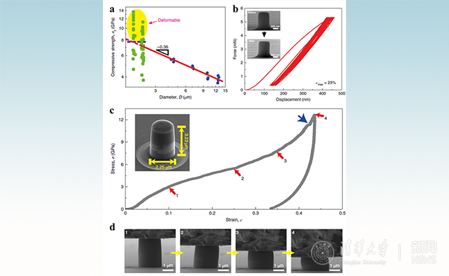 图1. 微纳米热解碳的原位电镜力学测试:(a)压缩强度随直径的变化;(b)原位压缩多周测试;(c)微纳米热解碳典型的应力-应变曲线;(d)原位压缩时的电镜照片。