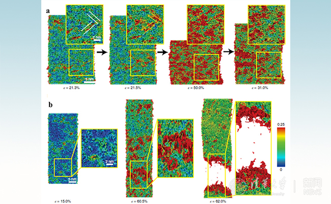 图3. 微纳米热解碳变形和破坏的分子动力学模拟:(a)压缩比变形;(b)拉伸变形。
