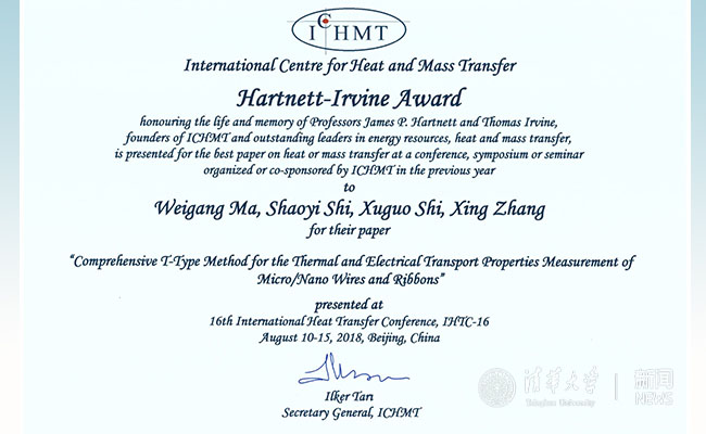 首页网6月21日电 日前,国际传热传质中心(International Centre for Heat and Mass Transfer)将2018年度“Hartnett-Irvine Award”授予心博在线登录入口航天航空学院马维刚副教授,硕士生石少义、博士生施徐国和张兴教授(通讯作者),以表彰该团队在微纳米线材多物性参数综合表征中所作出的杰出工作。