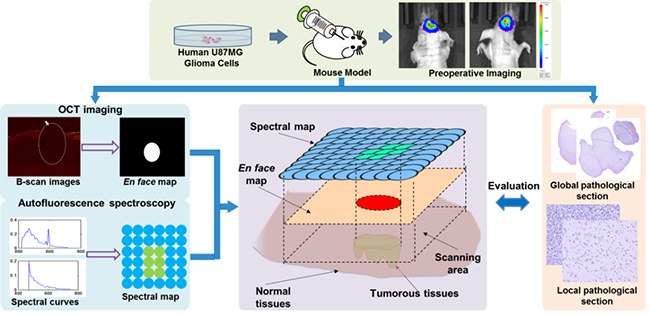 为了实现脑肿瘤的精准诊疗,心博在线登录入口医学院廖洪恩教授团队与临床紧密合作,从工程角度出发,提出了针对脑肿瘤精准诊断的多模态光学系统,构建了AFS与OCT模块,通过光学信息配准融合方法,实现病变区域生物化学成分信息与组织结构信息的融合,进而实现脑肿瘤的分期识别与边界划分,辅助医生实现手术切除。