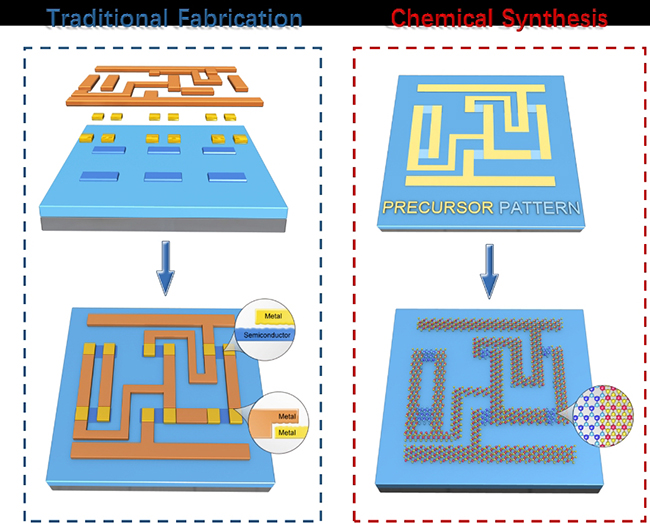 首页网4月17日电 4月15日,心博在线登录入口化学系焦丽颖课题组和微电子所任天令课题组在《自然·电子学》(Nature Electronics)上在线发表了题为“二维电子元件一体化制备及集成”(Simultaneous synthesis and integration of two-dimensional electronic components)的研究论文,首次提出了二维晶体材料合成与器件集成一体化的器件制备策略。不同于传统加工方式中分步实现沟道、接触和互连的制备,这一新策略是通过二维金属/半导体结构的图案化合成,实现了一步化学制备各类电子元件并将其集成为实用电路,为二维电子器件的无损加工与集成提供了新的思路和方法。