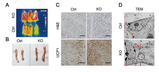(A)小鼠体温(B-C)脂肪形态变化以及Ucp1免疫组化染色(D)电镜下脂肪以及线粒体形态,箭头所指为线粒体。
