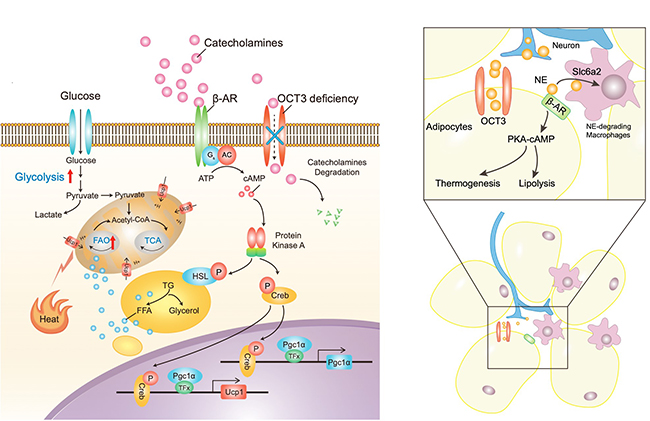 在本篇研究中,陈立功课题组发现脂肪细胞高表达3型阳离子转运蛋白和儿茶酚胺类物质代谢酶,具备代谢儿茶酚胺的分子基础。通过同位素标记的底物转运实验,发现脂肪细胞的Oct3可以高效转运包含去甲肾上腺素在内的儿茶酚胺类物质,并且具有高转运能力、低亲和力的转运特性。在寒冷刺激下,敲除该蛋白的脂肪呈现更明显的脂肪棕色化现象,并使得包含产热、脂肪酸氧化、糖酵解在内的一系列基因表达上调,能量消耗增加,最终增强机体产热过程,并且这一过程依赖于β-AR-cAMP-PKA通路。该研究指明了脂肪细胞内存在转运儿茶酚胺类物质的关键蛋白Oct3,区别于之前已经报道的交感神经末梢以及脂肪巨噬细胞中的转运机制,填补了该领域在白色脂肪米色化以及交感神经信号负向调控通路的空白。发展针对OCT3的特异性抑制剂或者抗体有望为肥胖和糖尿病等代谢疾病提供新的治疗途径。