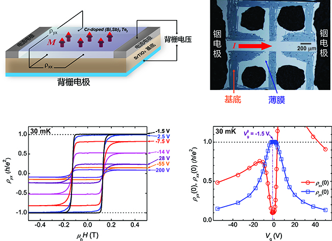 2011年底,在准二维、体绝缘的拓扑绝缘体中实现了自发长程铁磁性,并利用外加栅极电压对其电子结构进行原位精密调控。