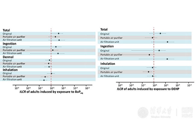 研究发现,在不使用任何空气净化手段的自然通风住宅中,约有97%及76%的目标人口对应暴露于BaPeq(等效苯并芘)和DEHP(邻苯二甲酸二(2-乙基)己酯)的癌症风险增量超过10-6(美国环保局规定限值,超过此限值说明致癌风险不可忽略)。在使用了家用空气净化器的自然通风住宅中,约有80%及25%的目标人口对应暴露于BaPeq和DEHP的癌症风险增量超过10-6的限值。在装载了具有空气净化功能的新风系统住宅中,约有84%和87%的目标人口对应暴露于BaPeq和DEHP的癌症风险增量超过10-6的限值。