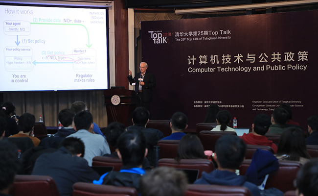 兰普森教授首先发表了“计算机技术与公共政策”为主题的演讲,他提出,随着计算机在现代社会的普遍应用,科技应当与规范监管和社会进程相协调,并列出了三个与该问题紧密联系的例子作为演讲的主线。