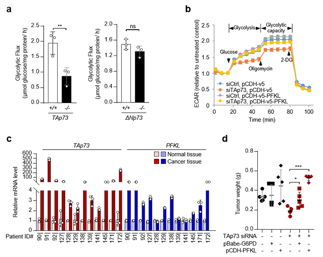图a,利用碳13标记的葡萄糖代谢流分析TAp73野生型细胞和TAp73缺陷细胞,以及ΔNp73野生型与ΔNp73缺陷细胞的葡萄糖酵解活性。图b,Seahorse实验分析对照组细胞,TAp73敲低和磷酸果糖激酶PFKL过表达的肿瘤细胞的胞外酸化率(ECAR)。图c,TAp73和PFKL基因在不同结肠癌病人的表达分析。图d,小鼠成瘤实验表明PFKL的过表达可以回补TAp73缺失肿瘤细胞的成瘤能力。
