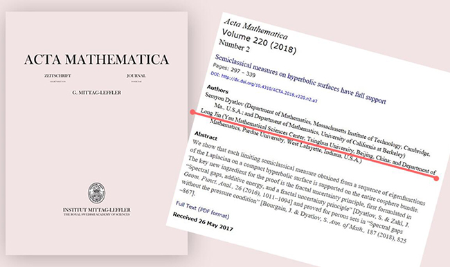 首页网9月18日电 近日,丘成桐数学科学中心助理教授金龙与美国加州大学伯克利分校塞米扬·迪亚特洛夫(Semyon Dyatlov)教授合作论文《双曲曲面上半经典测度具有全支集》(Semiclassical measures on hyperbolic surfaces have full support)在国际顶尖数学期刊《数学学报》(Acta Mathematica)上在线发表。该论文成果对于理解量子混沌系统具有重要的意义。著名数学家史蒂芬·泽尔奇(Steven Zelditch)教授评价此文为该领域近十年来最好的文章。