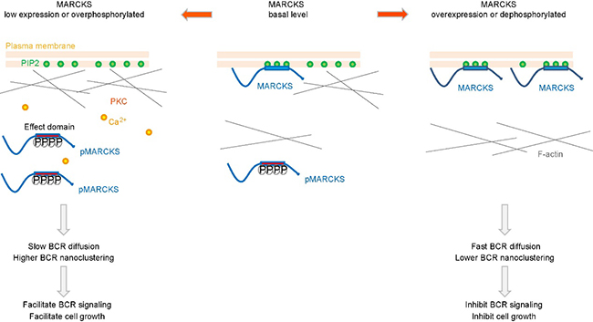 进一步的分子机理研究表明,这三种分子通过调节MARCKS与质膜内叶的结合强度而影响BCR的运动速率。质膜解离状态的MARCKS或者MARCKS基因敲除显著降低BCR的侧向布朗运动,与之相反质膜结合状态的MARCKS或者MARCKS过表达显著增加BCR的侧向布朗运动。体外和体内的功能性实验均揭示,质膜结合状态的MARCKS显著抑制B细胞肿瘤细胞(BJAB和HBL1)的增殖和小鼠原代B细胞的存活。在精细分子机理层面,该论文发现质膜结合状态的MARCKS通过扰乱膜皮层微丝骨架和质膜内叶之间的相互作用来增加BCR侧向移动速率,并因此减少BCR纳米簇程度,导致抑制滋养和慢性活化的BCR信号强度。