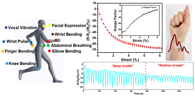 首页网8月30日电 8月28日,心博在线登录入口微纳电子系任天令教授团队在《美国化学学会纳米》(ACS Nano)上发表了题为《用于人体运动检测的负电阻变化石墨烯织物应变传感器》(“Graphene Textile Strain Sensor with Negative Resistance Variation for Human Motion Detection”)的研究论文。该传感器呈现出一种全新的特性,显示出负电阻变化特征,传感器与衣物完美贴合,可以直接缝制在衣物上用于检测腹式呼吸速率、脉搏等。该传感器真正实现了与服装完美的集成,在生理信息检测和人体活动监测等方面有着重大的应用前景。