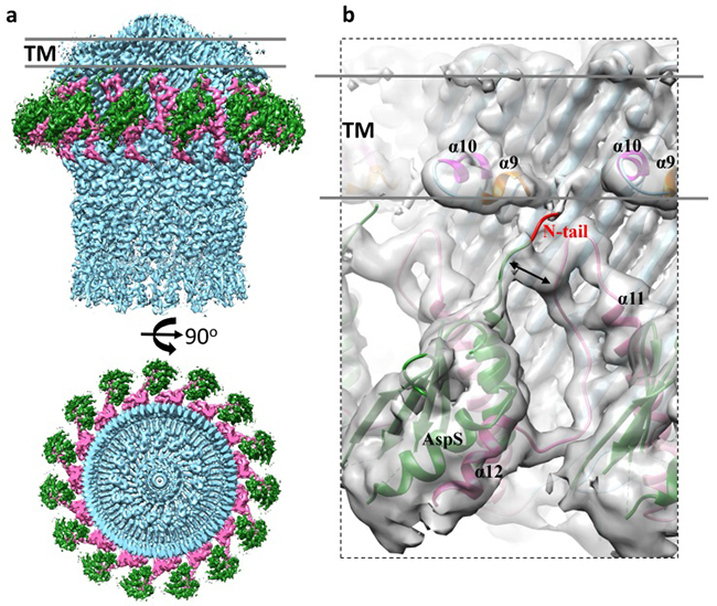 该工作首先通过荧光共定位实验,吸附洗脱实验以及冷冻电镜二维平均的方法证明了肠毒性大肠杆菌的YghG蛋白是分泌通道蛋白的定位蛋白(简称为AspS), 并且证明了定位蛋白与分泌通道蛋白能在体内形成稳定的复合物。通过单颗粒重构的方法解析了大肠杆菌来源的全长定位蛋白-分泌通道蛋白复合物3.2埃分辨率的分子结构,揭示了该复合物中定位蛋白AspS和分泌通道蛋白GspD具有15:15的组装比例,与课题组之前报道的分泌通道蛋白十五重对称结构相吻合。