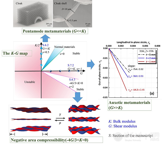 超材料是借助于人工功能基元构筑的、具有自然材料不具有的超常物理性能的一大类新型人工材料。力学超材料可基于四个弹性常数(即弹性模量,剪切模量,体模量和泊松比)来分类。在体模量和剪切模量关系的K-G图中,呈现了目前所常用的自然材料是在第一象限的狭长区域,而人工构筑的力学超材料已经开始向外拓展:当剪切模量G远远小于体模量K时,是五模式超流体结构材料;当剪切模量G远远大于体模量K时,为负泊松比拉胀材料;当体模量为负值,并与剪切模量满足一定关系时,所设计的结构材料可以在第四象限稳定存在,即为负可压缩性材料。