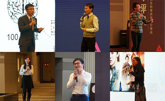 6名研究生特等奖学金获得者代表讲述他们的故事。(从左至右由上到下依次为:彭翃杰、郭雨晨、倪兵、阴亚楠、李国洋、孙可佳。)