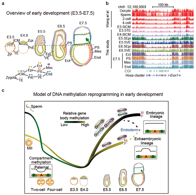 图1. a, 小鼠胚胎E3.5至E7.5早期胚胎发育谱系分化示意图。b,小鼠早期胚胎Hoxa基因簇附近甲基化分布情况。c, 模式图显示受精卵至E7.5天早期谱系分化过程中甲基化动态变化。图片摘自Zhang et al., Nature Genetics, 2017.