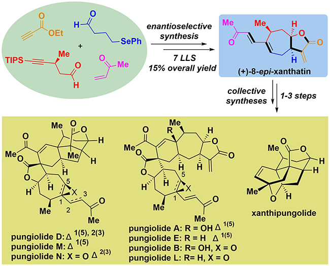 2012年,该课题组首先报道了一类新颖的γ-环丁内酯(Dyotropic)重排反应,并以此为关键步骤实现了一系列具有5-7反式并环的苍耳烷型倍半萜单体的全合成(Angew. Chem. Int. Ed. 2012, 51, 6984-6988)。2014年,该课题组以具有5-7反式并环的单体苍耳素(Xanthatin)为前体,通过仿生合成策略实现了该家族多个结构更为复杂的二聚体的首次全合成(Angew. Chem. Int. Ed. 2014, 53, 14494-14498)。在本项研究工作中,该课题组发展了一条高效简洁的不对称合成路线,仅通过7步反应即实现了该家族具有5-7顺式并环的单体苍耳素(8-Epi-xanthatin)的全合成。在此基础上,以该化合物为前体,通过一系列仿生串联反应完成了复杂天然产物变苍耳内酯 (Xanthipungolide)的首次全合成。另外,同样以该化合物为前体,以仿生狄尔斯—阿尔德(Diels-Alder)二聚化反应为关键步骤,实现了辛辣内酯(Pungiolide A, B, D, E)和L–N等多个苍耳烷型倍半萜二聚体的首次全合成。