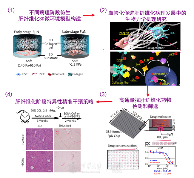 图2 研究成果简介:构建了模拟肝脏纤维化病理发展从早期到晚期不同阶段的体外仿生3D微环境模型(1),首次报道了肝窦毛细血管新生过程中通过胶原纤维传递的机械力学刺激信号在促进肝脏纤维化发展中的作用和机制(2),并且通过高通量药物检测和筛选(3) 进一步针对肝纤维化病理阶段特异性提出抗纤维化的精准干预治疗方案(4).