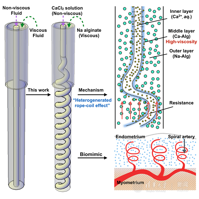 首页网9月19日电 9月13日,清华化学系梁琼麟研究组在《先进材料》(Advanced Materials)发表基于微流控的生物材料制备技术研究的新成果,并作为当期杂志内封面(《先进材料》. 2017, 29, 1701664)。该研究首次报道了含螺旋血管通道的生物水凝胶纤维的生成技术,实现了血液灌注功能及物质输运扩散动力学的研究,并提出了结合微流控反应与微流体力学的“异质生成卷绳效应”,为含螺旋通道或直通道的水凝胶纤维的可控制备奠定了理论基础。