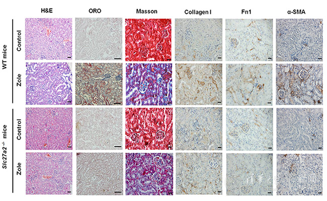 陈立功课题组通过建立唑来膦酸导致细胞、动物毒性模型,系统性利用蛋白组学、代谢组学、分子生物学等技术手段发现,唑来膦酸一方面可以通过激活TGFβ-Smad3信号通路,导致胶原蛋白表达的升高和金属蛋白酶抑制剂合成增加,胶原的肾脏沉积增多,形成肾脏组织纤维化;另一方面通过促进长链脂肪酸转运蛋白SLC27A2表达增加脂肪酸摄取、同时抑制脂肪酸β氧化导致脂质积累,从而对肾组织产生脂毒性,促使肾小管或肾间质细胞去分化,进而促使肾脏纤维化。陈立功课题组通过Slc27a2基因敲除小鼠发现,与野生型小鼠相比,Slc27a2基因敲除小鼠可以明显缓解唑来膦酸导致的肾损伤;另外,研究发现,较之单一使用唑来膦酸组,野生型小鼠同时使用唑来膦酸和过氧化物酶体增殖物激活受体(PPARα) 激动剂非诺贝特组也可以显著缓解唑来膦酸导致的肾损伤,这在一定程度上为唑来膦酸毒副作用的治疗提供了新的思路。