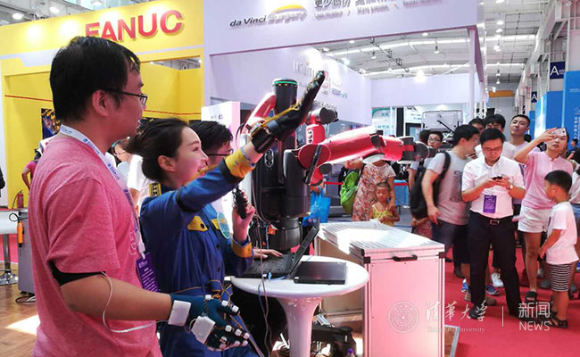 湖南卫视主持人体验通过数据手套控制机器人系统。