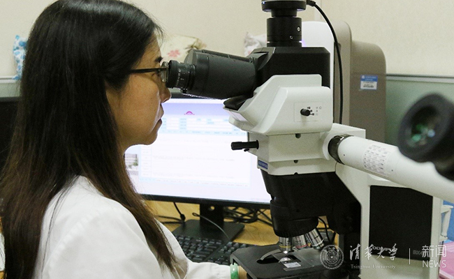北京清华长庚医院病理科主任尹洪芳用显微镜观察病理切片。 向凌霄 摄