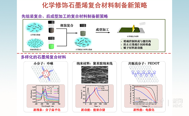 团队经过多年的悉心灌溉,终于收获了创新的果实。团队创造性地提出了具有共轭结构小分子或高分子非共价修饰制备水溶性石墨烯的新方法。简而言之就是采用非共价修饰的方法在石墨烯的表面修饰一些基团,让它从不溶解的状态变成可溶的状态,同时保留石墨烯本身的性能和结构,并赋予它新的功能。这一新方法为发展和完善可溶性石墨烯制备技术提供了新思路。