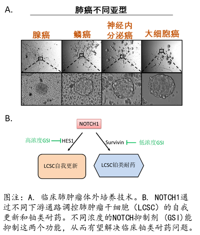 课题组利用自己原创的临床肺肿瘤及肿瘤干细胞研究技术,进一步从大量临床肺肿瘤中分离出一个新颖的肺肿瘤干细胞群体。这个群体具有导致肺肿瘤发生,自我复制、和维持肿瘤传代的能力,也就是肺肿瘤发生、发展的根源。而且,进一步研究发现这个群体是导致临床肿瘤对一线化疗药物顺铂耐药的根源。在这些致癌、耐药细胞中,NOTCH1信号通路同时调控着肺肿瘤干细胞的自我更新,同时也是导致铂类化疗耐药的原因。