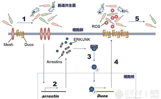 昆虫肠道细胞通过双氧化酶(Duox)产生的活性氧(ROS)对肠道微生物菌群进行调控,但是双氧化酶系统调控肠道菌群的分子机制却没有得到有效阐明。在该项研究中,研究者首先利用RNA干扰 (RNAi) 筛选的方法,在埃及伊蚊体内鉴定出一种细胞膜蛋白(Mesh)在肠道共生菌调控的过程中起到重要作用,随后鉴定出细胞膜蛋白通过抑制蛋白(Arrestin)介导的丝裂原活化蛋白激酶(MAPK)中氨基末端激酶/细胞外信号调节激酶(JNK/ERK)的磷酸化级联反应,引起双氧化酶的表达变化,导致生成的活性氧(ROS)水平变化,最终对肠道共生菌的增殖进行调控。随后,研究者在果蝇模型中对发现的分子机制进行了全面验证。该研究首次揭示了重要病媒昆虫肠道微生物菌群稳态的调控机制。