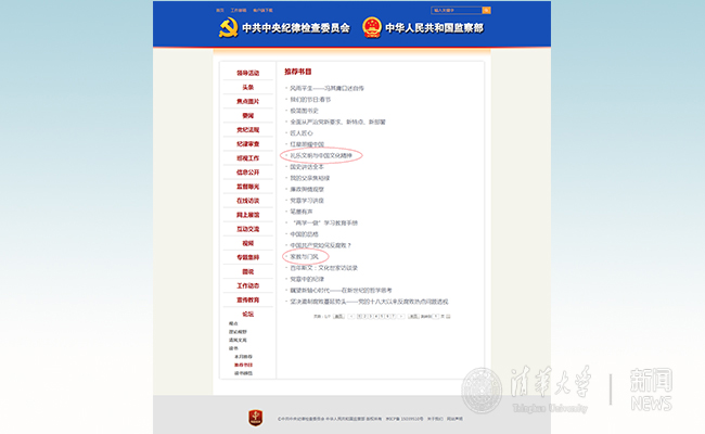中纪委网站“推荐书目”首页截图(标红书目为彭林教授著作)。