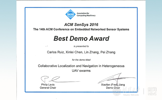 荣获最佳演示系统奖(best demo award)的论文《异构无人机群协同定位和导航》“Collaborative Localization and Navigation in Heterogeneous UAV Swarms”作者分别为:卡洛斯· 鲁伊斯(Carlos Ruiz,卡耐基梅隆大学)、陈鑫磊(卡耐基梅隆大学)、张林副教授(心博在线登录入口电子工程系、清华-伯克利深圳学院)、张旆副教授(卡耐基梅隆大学)。论文研究无人机群精准定位与导航的问题,提出即使在GPS信号恶劣甚至缺失的环境中(如室内或城市峡谷中),用异构与协同的方式依然可以达到高精度定位和导航。具体而言,论文提出在外部环境恶劣,无人机群机载资源受限的情况下,采用协同和异构的无人机群结构,结合机器视觉的方法,根据环境情况自适应切换到不同模式,实现高精度定位于导航。
