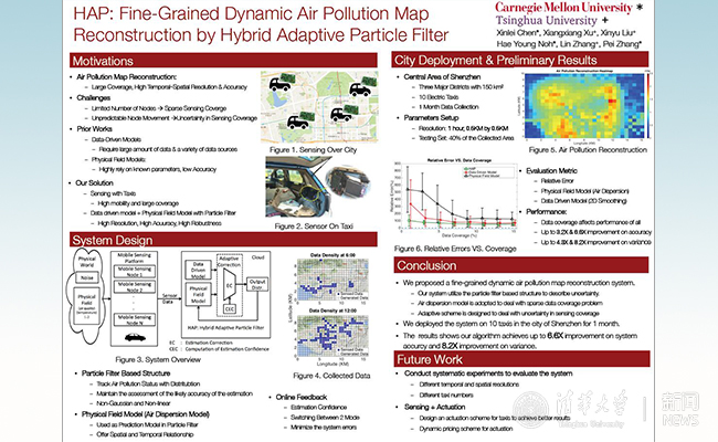 荣获最佳海报提名奖(best poster runner-up award)的论文《HAP -混合自适应粒子滤波器实现动态高精度空气污染信息场重建》“HAP- Fine-Grained Dynamic Air Pollution Map Reconstruction by Hybrid Adaptive Particle Filter”作者分别为:陈鑫磊(卡耐基梅隆大学)、徐祥祥(心博在线登录入口电子工程系)、刘新宇(心博在线登录入口电子工程系)、卢海永(Hae Young Noh,卡耐基梅隆大学)、张林副教授(心博在线登录入口电子工程系、清华-伯克利深圳学院),张旆副教授(卡耐基梅隆大学)。论文研究解决重建城市范围高时间和空间分辨率的动态空气污染信息场问题。提出通过将自主设计的低成本空气检测系统安装在出租车上,实时采集城市空气污染数据。基于传统的粒子滤波理论,本研究设计了一套混合自适应结构,融合了数据模型和物理模型的优势,实现了在数据稀疏且传感覆盖不确定的情况下,高精度实时恢复空气污染信息场。