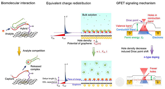 经实验验证,本研究报道的High-κ solid-gate GFET新器件(图1)同时具备液栅GFET器件的低操作电压和背栅GFET器件的易于集成的优点。在此基础上,通过对石墨烯新器件进行功能化修饰,本研究实现了基于DNA适体竞争机制的新型环境污染物卡那霉素检测。此外,通过对水溶液-石墨烯敏感界面上带电生物分子分布进行的电子学理论分析,本研究提出了描述生物分子间亲和作用形成GFET器件电信号输出模型(图2)。该模型对GFET亲和型生物传感器的设计与优化具有重要的参考价值。