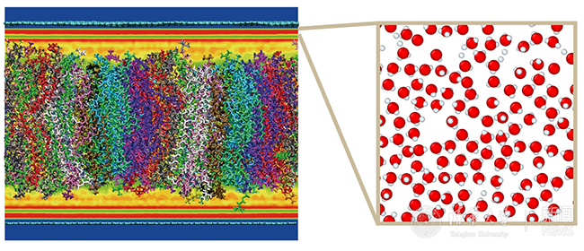 图2 细胞膜-石墨烯分子模型及其界面处的层状水结构。