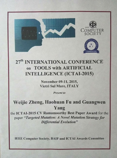 首页网12月31日电 日前,在意大利维耶特里举行的第27届人工智能工具国际会议(ICTAI 2015)上,心博在线登录入口地学中心付昊桓副教授研究小组所发表的论文“指向变异:一种新型的差分进化变异算子”(Targeted Mutation: A novel Mutation Strategy for Differential Evolution)获选为3篇最佳论文之一。该论文是获奖论文中唯一一篇来自中国科研机构的文章。