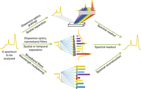 不同光谱仪工作原理比较图。(最上面是目前最广泛采用的光栅光谱仪的原理;最下面是量子点光谱仪的原理;中间为现有多数其他光谱仪技术原理。)