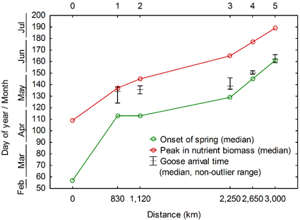 对于拥有极短繁殖期的极地繁殖雁来说,不仅需要足够的身体储备,还需要及早到达繁殖地才能成功繁殖。主流的绿波假说认为极地繁殖雁在由南至北的迁徙途中追随相继出现的春季萌发牧草,就像迁飞在绿色的波浪上一样。此前研究者在解译绿波时有不同的说法,有人认为是春季的开始(the onset of spring),即萌芽期的牧草,也有人认为是营养生物量最高的状态 (the peak in nutrient biomass),即中等生长阶段的牧草。其他研究发现极地繁殖雁采用一种资本繁殖和收入繁殖综合的策略,即产蛋所需营养在中途停歇地和繁殖地共同获得。这一策略使得极地繁殖雁在迁徙途中就开始积累身体储备从而可以及早到达繁殖地并开始繁殖。司亚丽等应用了基于遥感数据的绿波量化方法,提取了其迁徙路线上的牧草萌芽期和营养生物量的最高期,并结合黑雁个体迁徙停歇格局来对绿波假说进行验证。