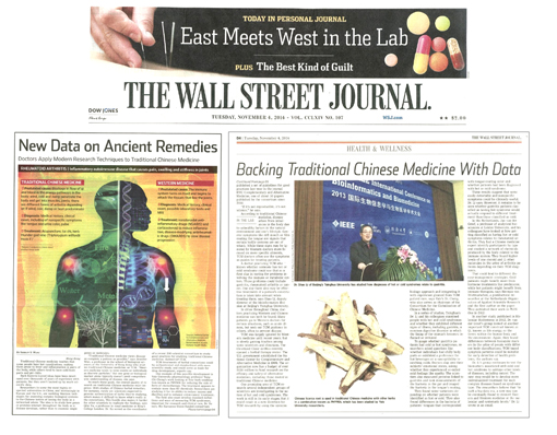 首页网11月19日电 日前,美国《华尔街日报》以“古老疗法的新资料(New data on ancient remedies)”为题,用两个版面刊发了一则关于中医药科学研究的长篇报道,并在报纸头条位置对该报道作了题为“实验室中的东西方交融(East Meets West in the Lab)”的推荐。该报道重点介绍了自动化系、信息国家实验室生物信息研究部李梢教授课题组的研究成果。