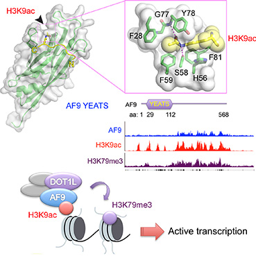 AF9蛋白是一类重要的转录调控因子,可以分别与组蛋白H3K79甲基化转移酶DOT1L和超级延伸复合物(SEC)形成复合物,在转录起始-延伸转换过程中发挥着重要调控作用。同时,临床遗传学研究表明AF9基因和MLL基因的融合(MLL-AF9)作为最常见的MLL重排类型,是导致人类急性髓细胞白血病(AML)以及急性淋巴性白血病(ALL)等疾病的驱动性因素。进一步的细胞生物学和功能基因组学研究发现,人AF9与H3K9ac修饰在全基因组水平有强烈的共定位,并且调控了包括MYC、BMP2、HOXA基因簇在内的细胞增殖分化基因的表达;此外,本研究首次表明AF9通过识别组蛋白H3K9乙酰化修饰,招募DOTL1到特定染色质区段,促进了组蛋白H3K79甲基化的共沉积和基因活化,揭示出一种新型组蛋白修饰交叉会话机制,体现了真核生物表观遗传调控的复杂和精密性。