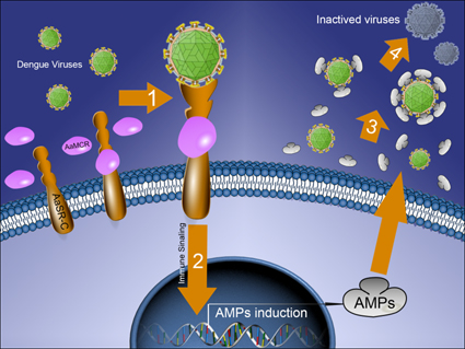 在该项研究中,程功研究组首先在埃及伊蚊中鉴定出一种人类补体因子C3的同源蛋白——巨球蛋白相关补体因子 (AaMCR) 具有明显的抗病毒功能;随后,研究团队对该补体系统进行了深入研究,鉴定出埃及伊蚊补体系统利用一种昆虫特有的清道夫受体 (AaSR-C) 作为模式识别受体识别病毒并诱导抗病毒短肽 (AMPs) 的表达,具体抗病毒机制描述如下:(1) 在埃及伊蚊血淋巴细胞(昆虫主要的免疫细胞) 表面的AaSR-C蛋白作为模式识别受体识别病毒颗粒;(2) AaSR-C结合补体因子AaMCR,从而形成一个“补体蛋白-病毒”复合体;(3)“补体蛋白-病毒”复合体激活下游信号通路产生大量的抗病毒短肽;(4) 抗病毒短肽杀灭病毒 (如图所示)。