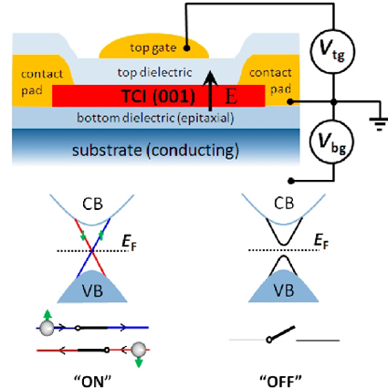 段文晖教授研究组与美国麻省理工学院傅亮教授等合作,首先将三维拓扑晶体绝缘体的概念推广到二维,提出了由镜面对称性保护的二维绝缘体的新型拓扑相,并证明这种新型的拓扑相可以在SnTe和Pbx Sn(1-x) Se(Te)(001)薄膜中实现。这种新型的拓扑材料,其体能带(bulk bands)具有能隙,但是在边缘上存在由(001)镜面对称性保护的具有自旋过滤(spin-filter)性质的边缘态(edge states)。更为重要的是,通过垂直于薄膜的电场,就可以破坏体系的镜面对称性,从而在边缘态上产生一个电场调控的能隙(electrically tunable gap)。利用这种奇异的特性,此研究提出了一种新型晶体管,称之为拓扑晶体管(topological transistor)。在这种晶体管中,电荷输运(charge transport)和自旋输运(spin transport)极大地纠缠在一起,并且可以被外加电场同时调控。由于拓扑晶体管的工作原理与传统晶体管的实现原理完全不同,其开/关状态并不需要实现n型电子和p型电子的复合,因而可以在拓扑晶体管中实现很高的开关速度(on/off speed),同时具有很小的能耗。