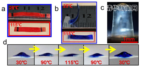 (c) 简单热塑得到的中空柱;(d)热塑得到的圆突起随温度可逆起伏。