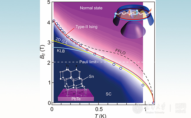 薛其坤教授研究团队长期从事原子级可控的高质量薄膜的制备和物性探索,在二维超导领域发现了单层铅膜超导、单层铁硒/钛酸锶界面高温超导和双原子层镓膜超导的格里菲斯奇异性等。2018年,团队核心成员张定副教授等人首次发现灰锡薄膜—锡烯—具有超导电性( 《自然-物理》Nature Physics, 14,344(2018)),随后发现其面内上临界磁场超过了常规超导体的上限—泡利极限。