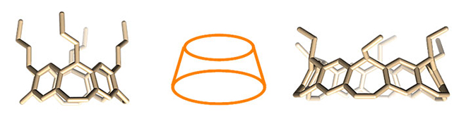 烯具有独特的圆台锥结构和空腔,最大内径达1纳米左右(图2),作为富电子空腔的主体分子,可以选择性地包合有机小分子。此外,环带[n]芳烃[n]