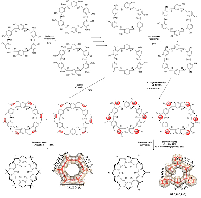 王梅祥课题组建立和发展了全新和通用的“跨湾造桥” 策略和多重分子内反应方法,充分利用唢芳烃本身预组织的单环结构和所具有的锥式构象,通过在