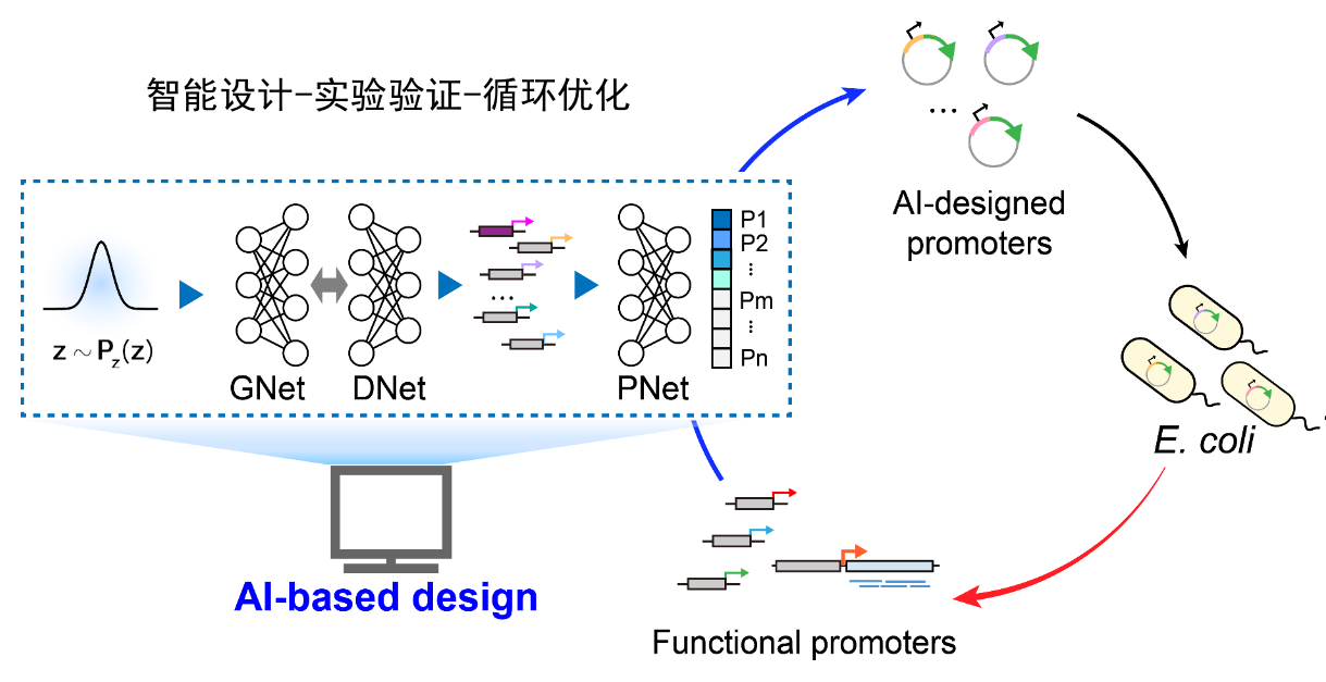 随着人工智能和大数据时代的到来,深度学习技术在复杂对象的特征表征、多模态融合、样本自动生成等问题中表现出独特的优势,为生物分子的设计提供了新的可能。该研究将人工智能技术应用于构建全新的基因调控元件,从自动化设计的角度,利用深度学习技术并融合生物先验知识来建立调控元件的生成模型。通过在计算机中的算法寻优部分替代生物实验上的随机搜索,可以大大提高实验的成功率。课题组在大肠杆菌中成功实现了全新基因启动子的设计与生成。该方法可以产生大量全新的启动子,经过迭代优化后实验验证成功率已超过 70%。这些由人工智能方法设计的全新元件具备了天然元件关键特征的统计特性,并同时具有一些非天然典型的序列模体,在整体序列排布上可以做到与天然启动子很低的相似性,降低了与天然基因组的同源重组风险。同时,优化后的人工元件可以具备比天然序列更高的转录活性。理论上,该方法可以产生数量远远超过天然启动子的全新元件,极大地丰富了可用于工程生物学研究的调控元件库。