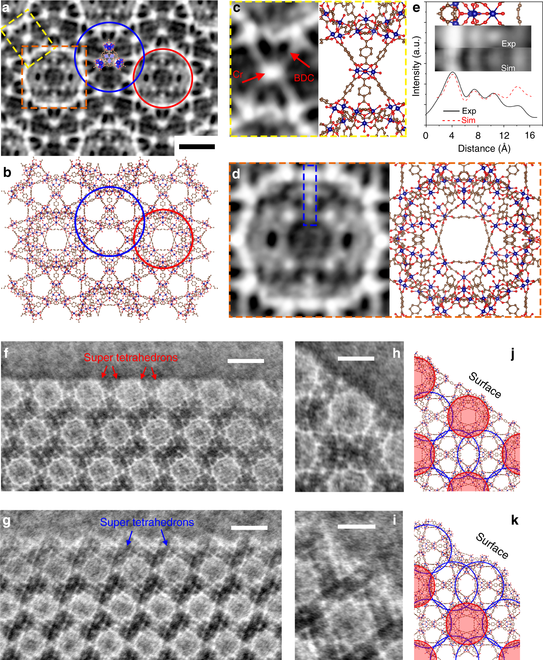 针对这一问题,心博在线登录入口化工系魏飞教授课题组借助积分差分相位衬度技术(iDPC-STEM),解决低电子束流下图像分辨率和信噪比低的问题,并通过控制电子剂量,以非常高的分辨率和信噪比对MIL-101,一种稳定的MOF材料,实现了原子级成像,分辨率可达1.8埃(图1所示),是目前文献报道中此材料的最高分辨率。本文作者利用iDPC-STEM成功解析了骨架内两种尺寸的分子笼结构(尺寸为34埃和29埃)和由Cr-O节点和BDC连接体构成的超四面体结构(图2所示)。基于这些原子级观察,揭示了MIL-101晶体两种不同的{111}表面结构及其稳定性(图2所示)。同时还观察了自组装晶体的表面、界面和缺陷的结构及演化。通过这些局部结构的表征,可以更好地了解MOF中节点和连接体的配位方式,进一步研究MOF的结构-性能关系。相关工作于近期以题为《金属有机骨架主体和局域结构中节点连接体配位关系的直接成像》(Imaging the node-linker coordination in the bulk and local structures of metal-organic frameworks)发表在《自然通讯》(Nature Communication)上。