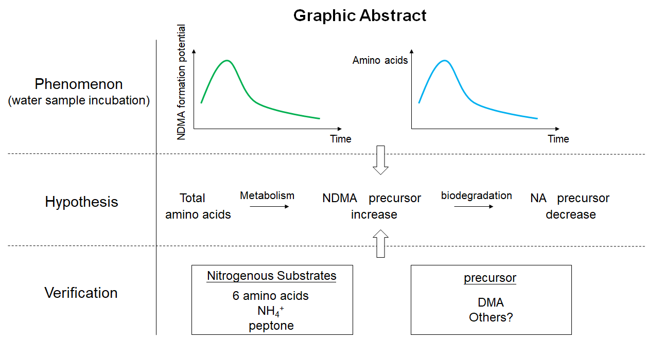 课题组首先发现多地水源水样品的亚硝胺前体物总量指标在未灭菌培养时均存在先升高后降低的趋势,提示存在微生物代谢生成亚硝胺前体物的可能性;对水样中有机物分类解析结果表明,氨基酸的浓度变化趋势与亚硝胺前体物总量有一定的相似性。随后,课题组分别采用氨基酸、氨氮和蛋白胨作为唯一氮源,非特异性接种微生物进行好氧或厌氧培养,也都发现存在类似的规律。6种氨基酸经生物代谢生成NDMA前体物的摩尔转化率在百万分之六十至两百之间,蛋白胨的摩尔转化率更高达百万分之三百五十。课题组还对微生物代谢产生的亚硝胺前体物进行了初步分析,发现分子量小于1000的胞外分泌物是主要的亚硝胺前体物来源,其次是分子量大于10k的胞外分泌物以及胞内成分。已知的NDMA前体物二甲胺也有检出,但贡献率很低。根据前期获得的全国水源水中亚硝胺前体物总量结果,结合水中氨基酸浓度的文献数据,在论文中最后估算含氮有机物的微生物代谢机制可贡献水源水中多达38%的亚硝胺前体物。
